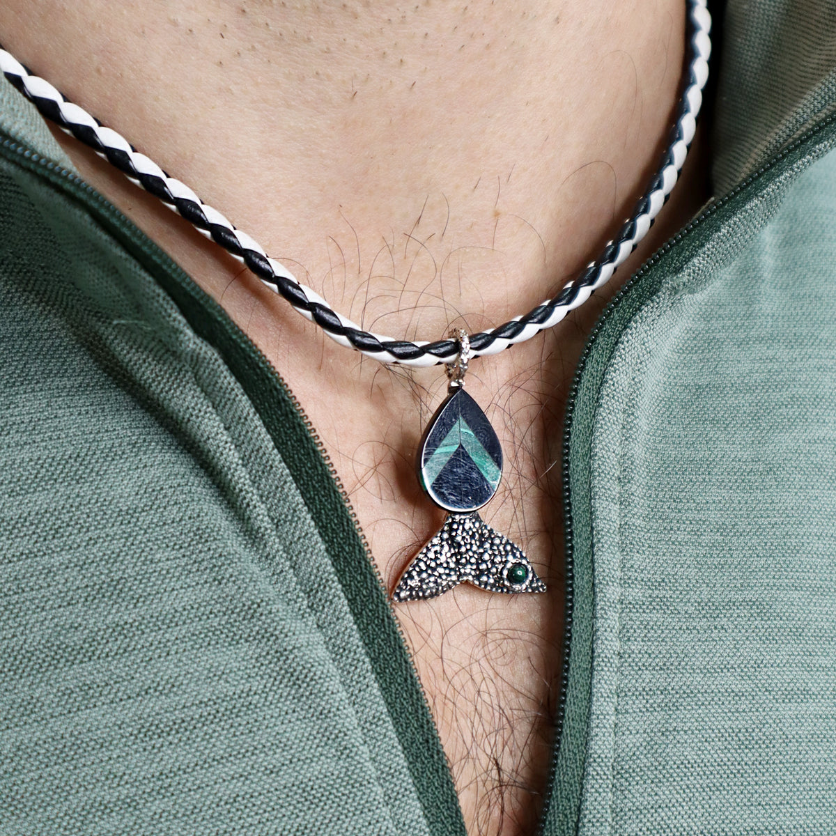Collar trenzado de hule en blanco y negro con dije de cola de ballena en plata .925 y mosaico de ónix con malaquita.