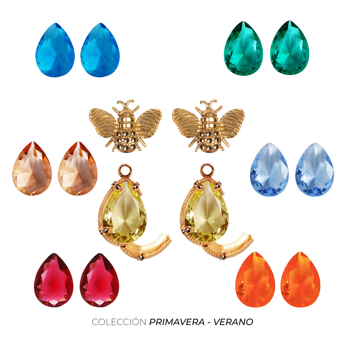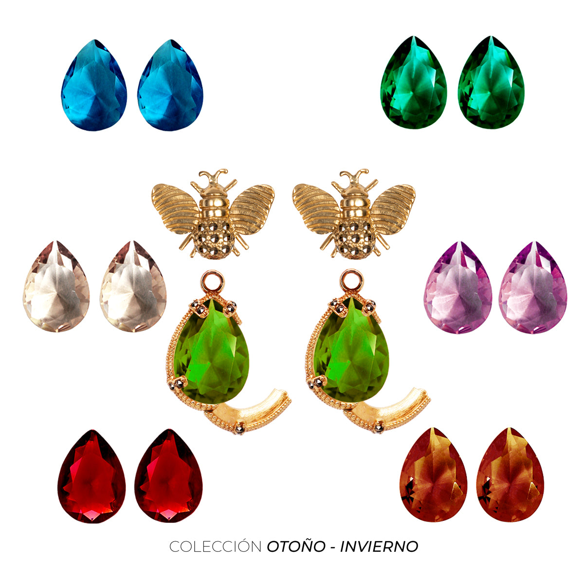 Hexágono de piel con kit de 7 pares de cristales desmontables, un Bisel/Portadrop de plata .925 con broche lateral y aretes de Abeja de plata .925 con baño de oro de 14k desmontables.