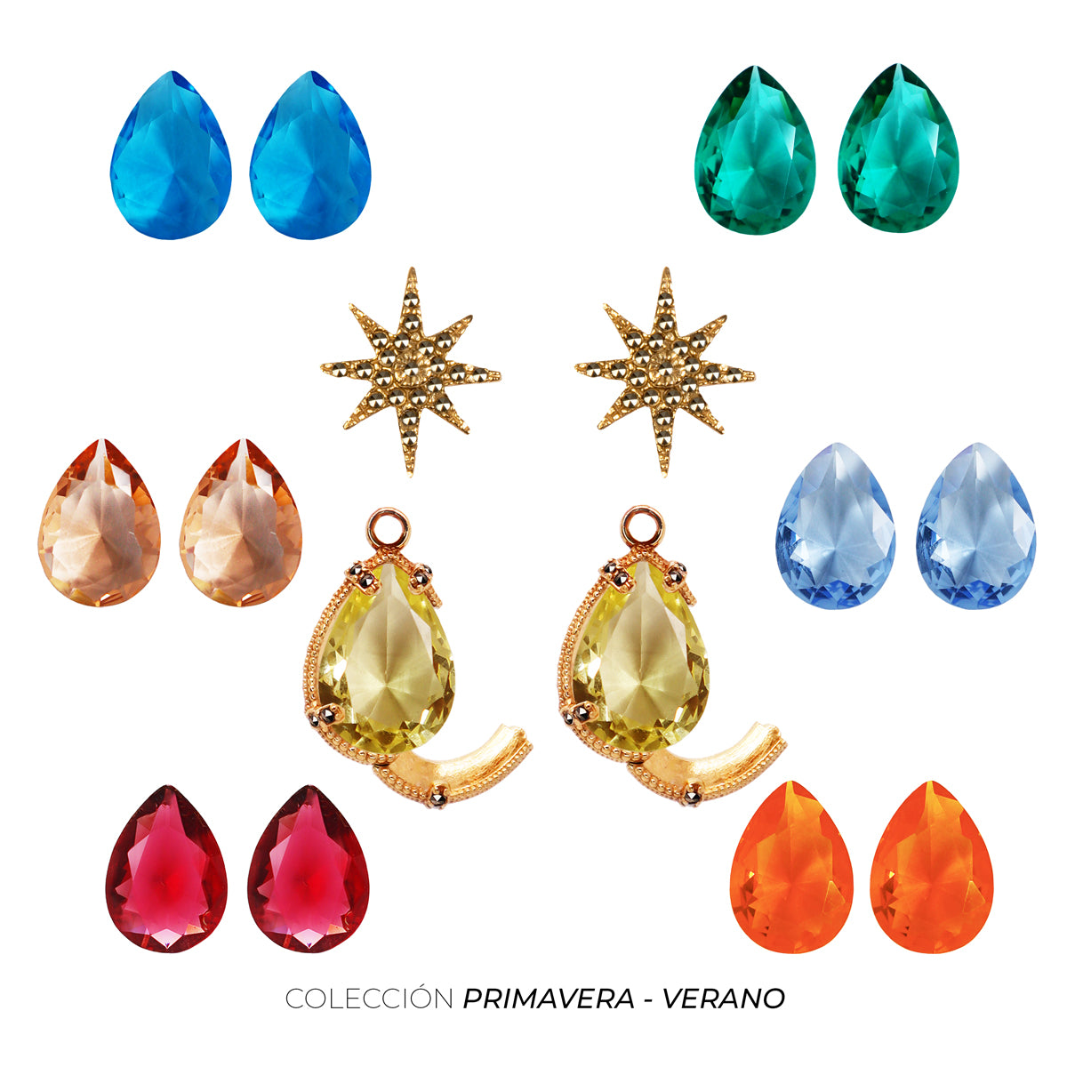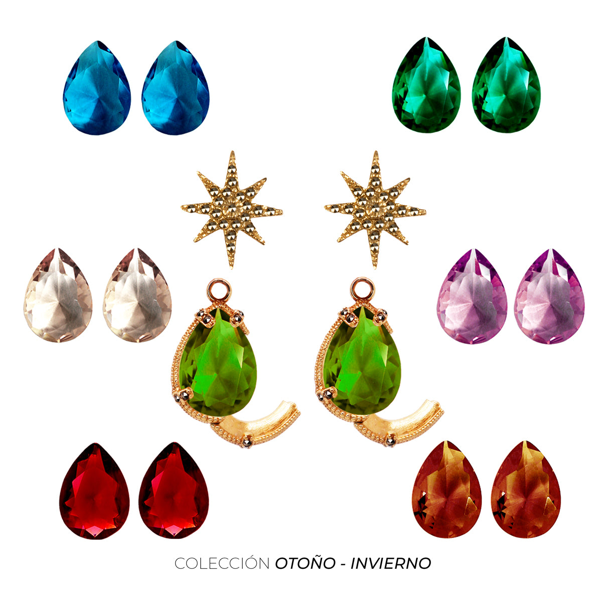 Hexágono de piel con kit de 7 pares de cristales desmontables, un Bisel/Portadrop de plata .925 con broche lateral y aretes de Polaris de plata .925 con baño de oro de 14k desmontables.