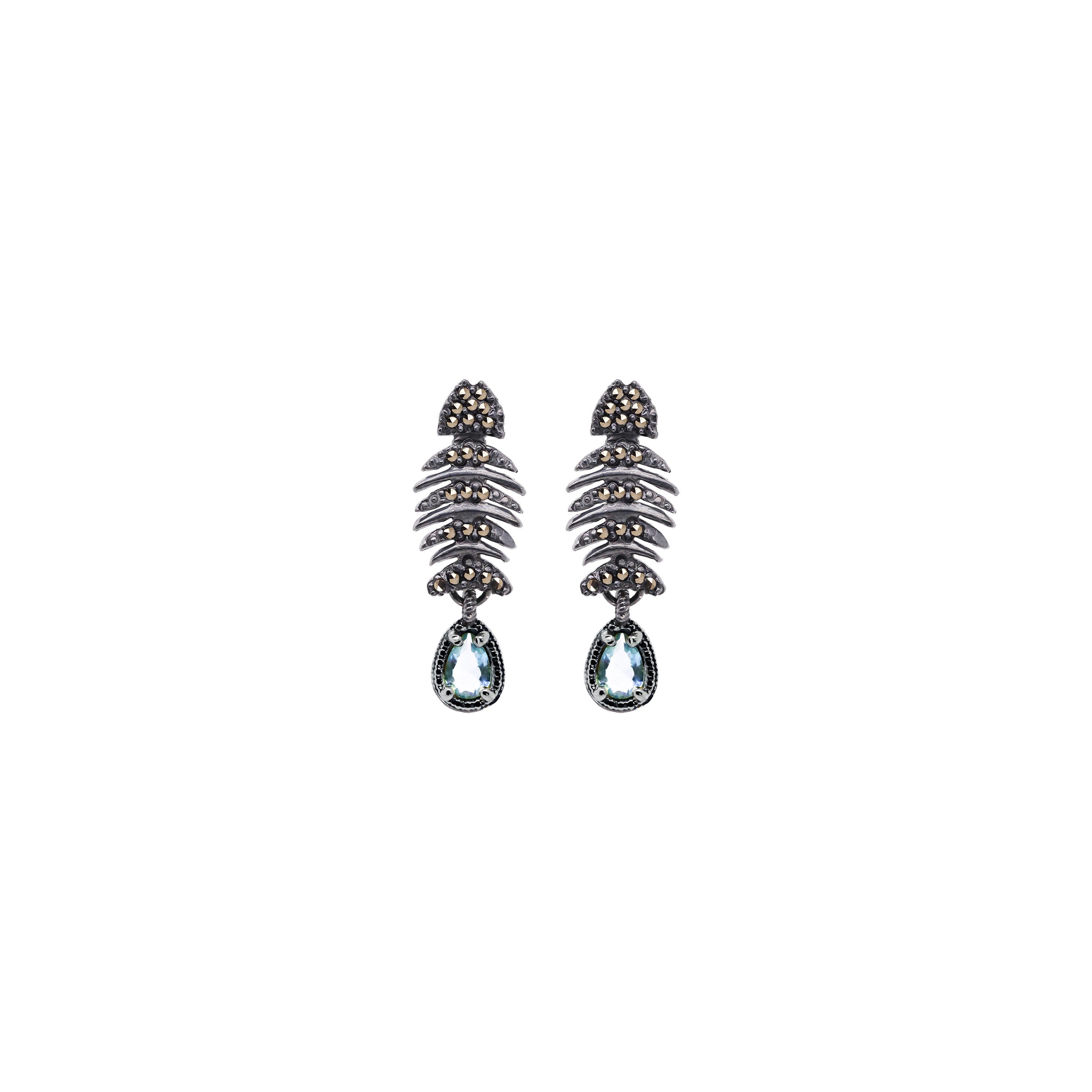Los Aretes Mini Pescado Pavonado con Drop Azul combinan arte y delicadeza en un formato mini. Elaborados en plata .925 con baño de oro de 14k, su acabado pavonado aporta profundidad y carácter.