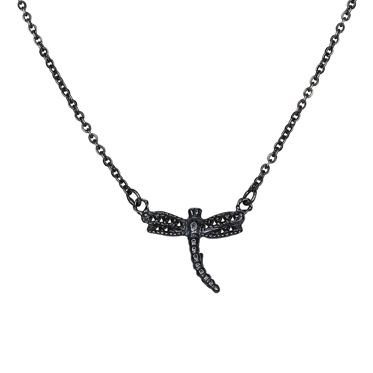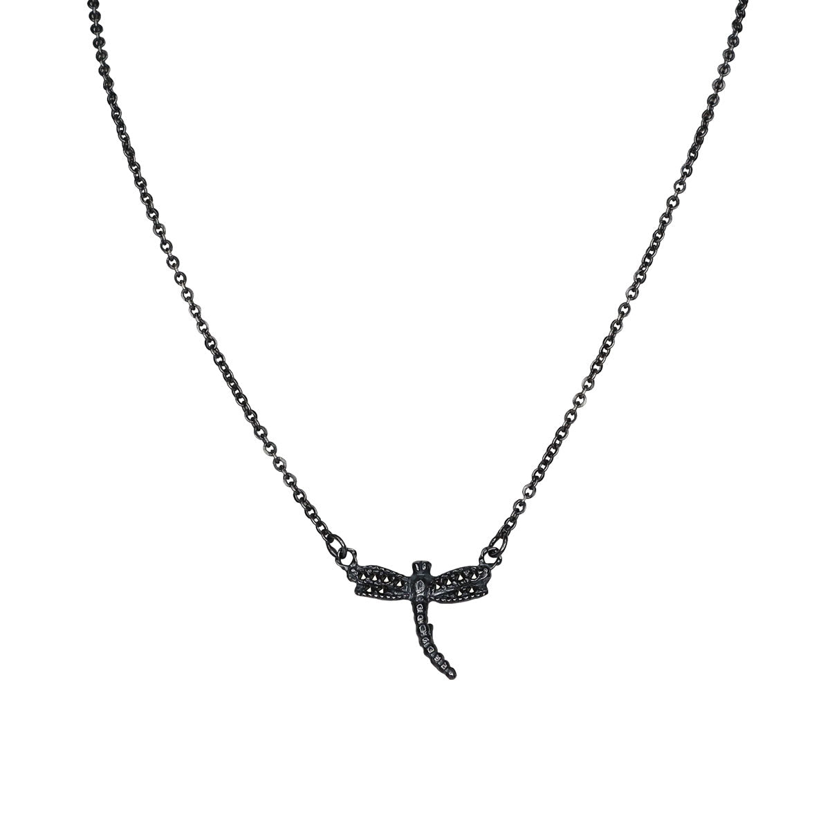 Cadena de libélula de plata .925 con patina grisácea y con incrustación de piritas.