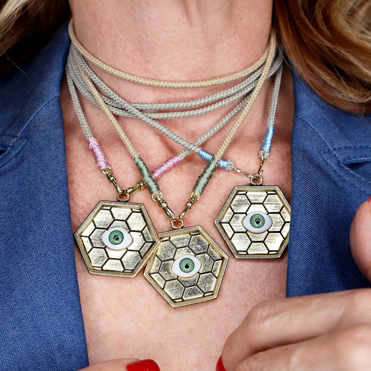 Colar de cordón con hilo y dije de colmena en baño de oro de 14K y ojo incrustado de resina.