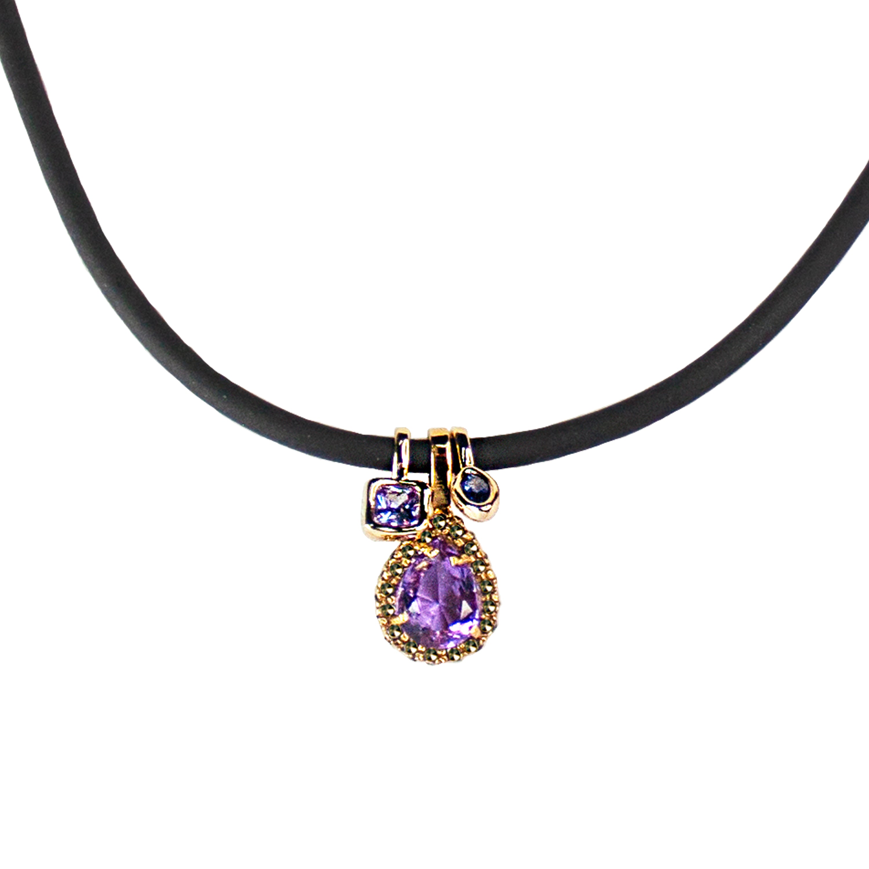 Collar de piel negro con tres mini dijes de plata .925 y baño de oro de 14kt con cristales en tonos lilas.