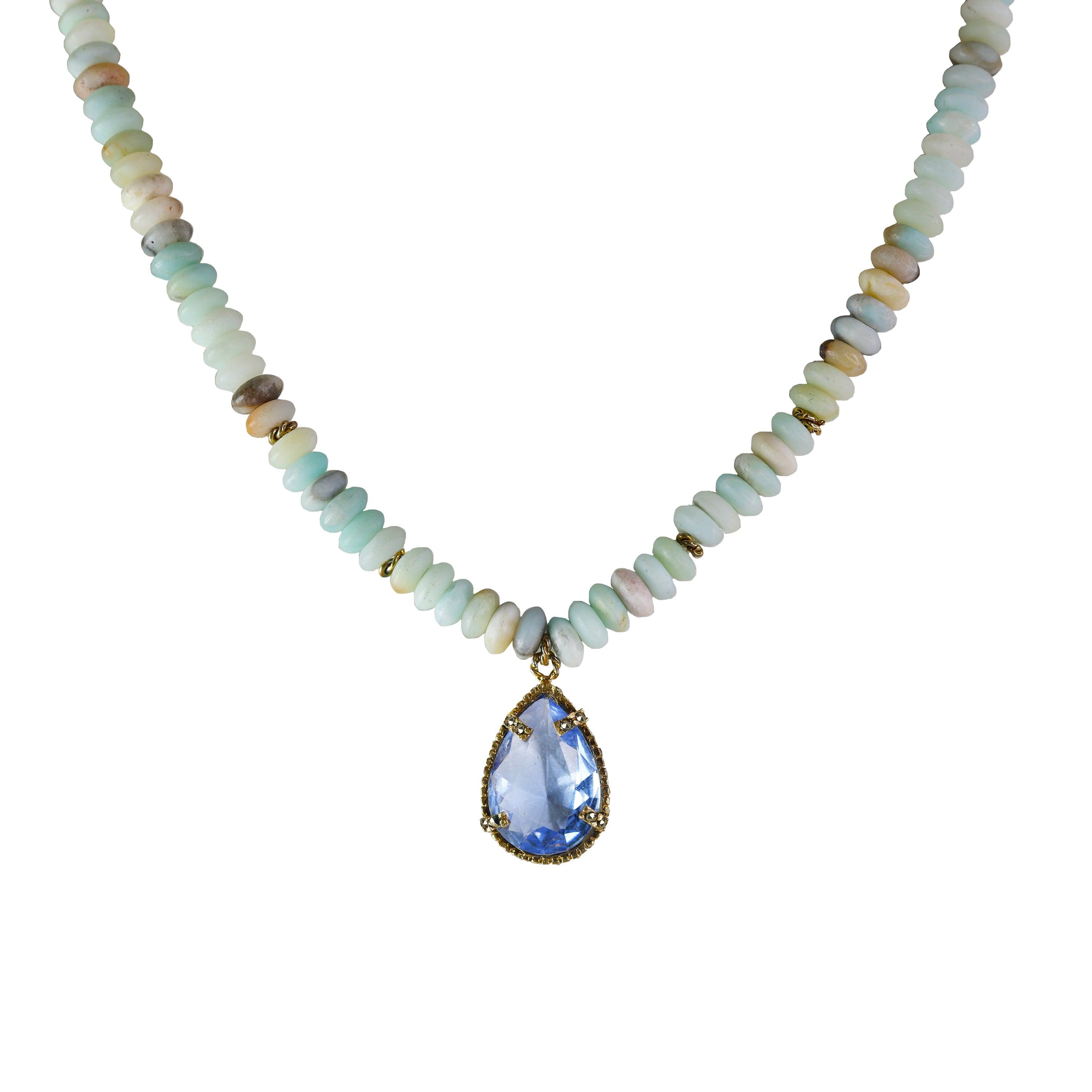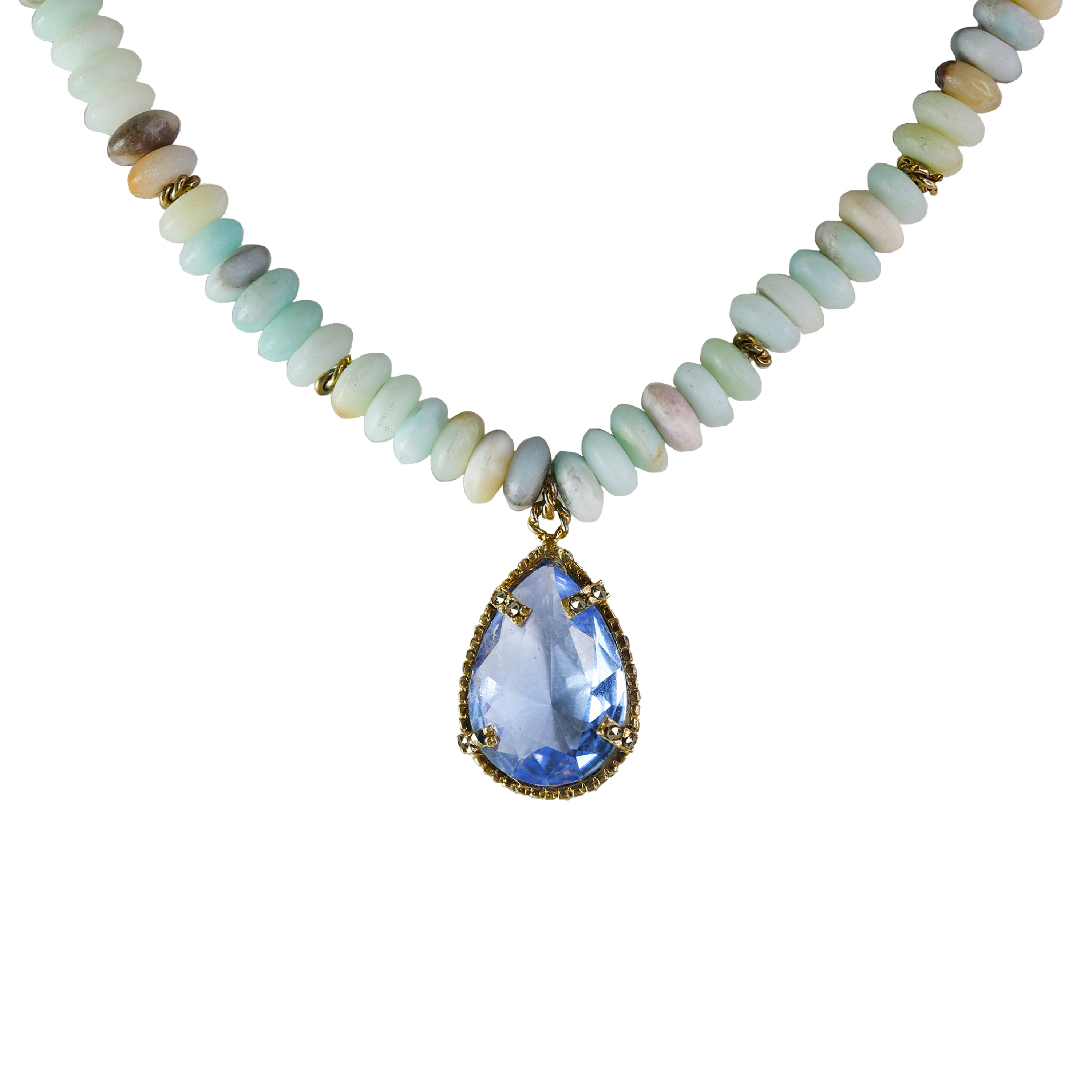 Collar de cuentas de colores con dije de drop color azul de plata .925 y baño de oro de 14k.