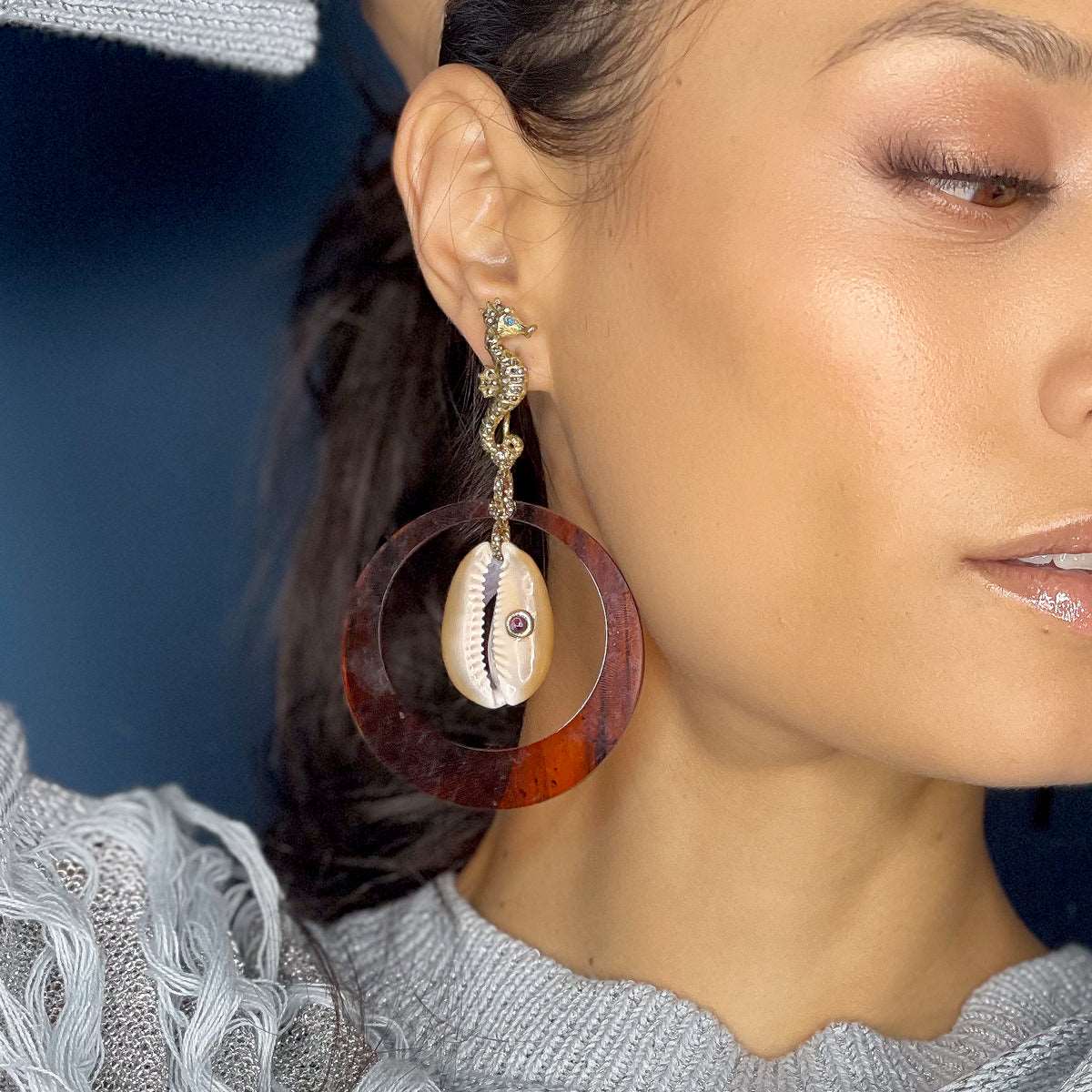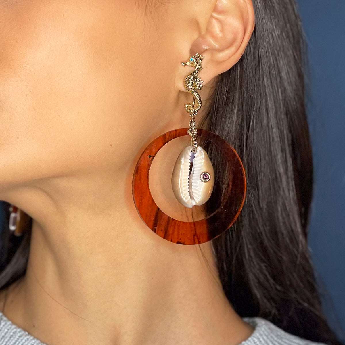 Boucle d'oreille hippocampe en argent .925 avec placage en or 14 carats et goutte en écaille de tortue en acrylique avec coquille naturelle.