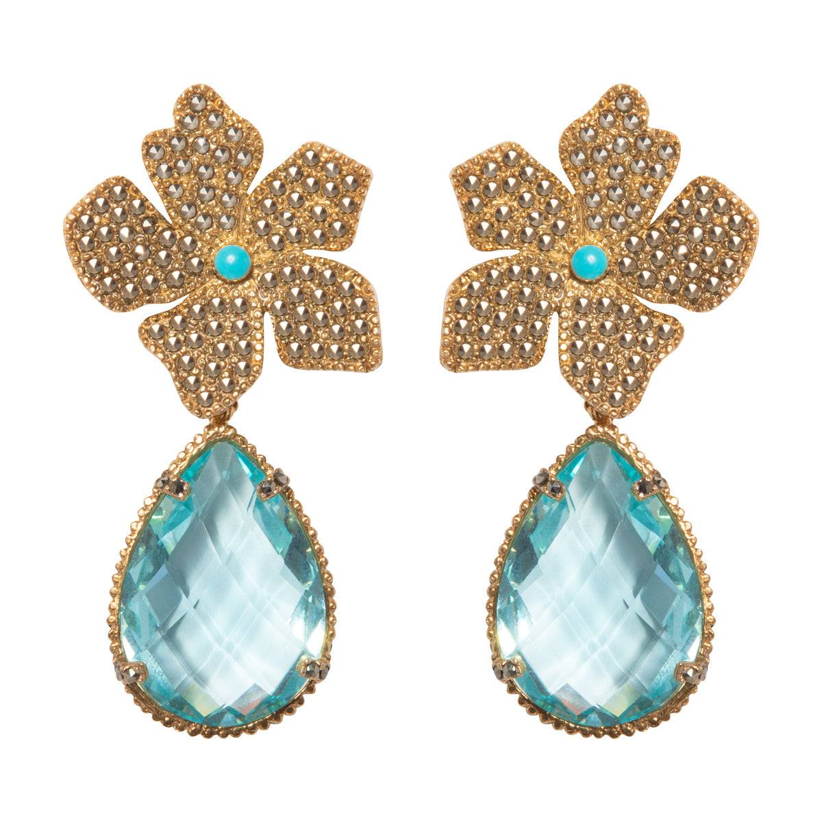 Boucle d'oreille fleur avec centre turquoise amovible en argent 925 plaqué or 14 ct avec goutte de cristal à facettes bleu Tatiana en argent 925 plaqué or 14 ct et incrusté de pyrites