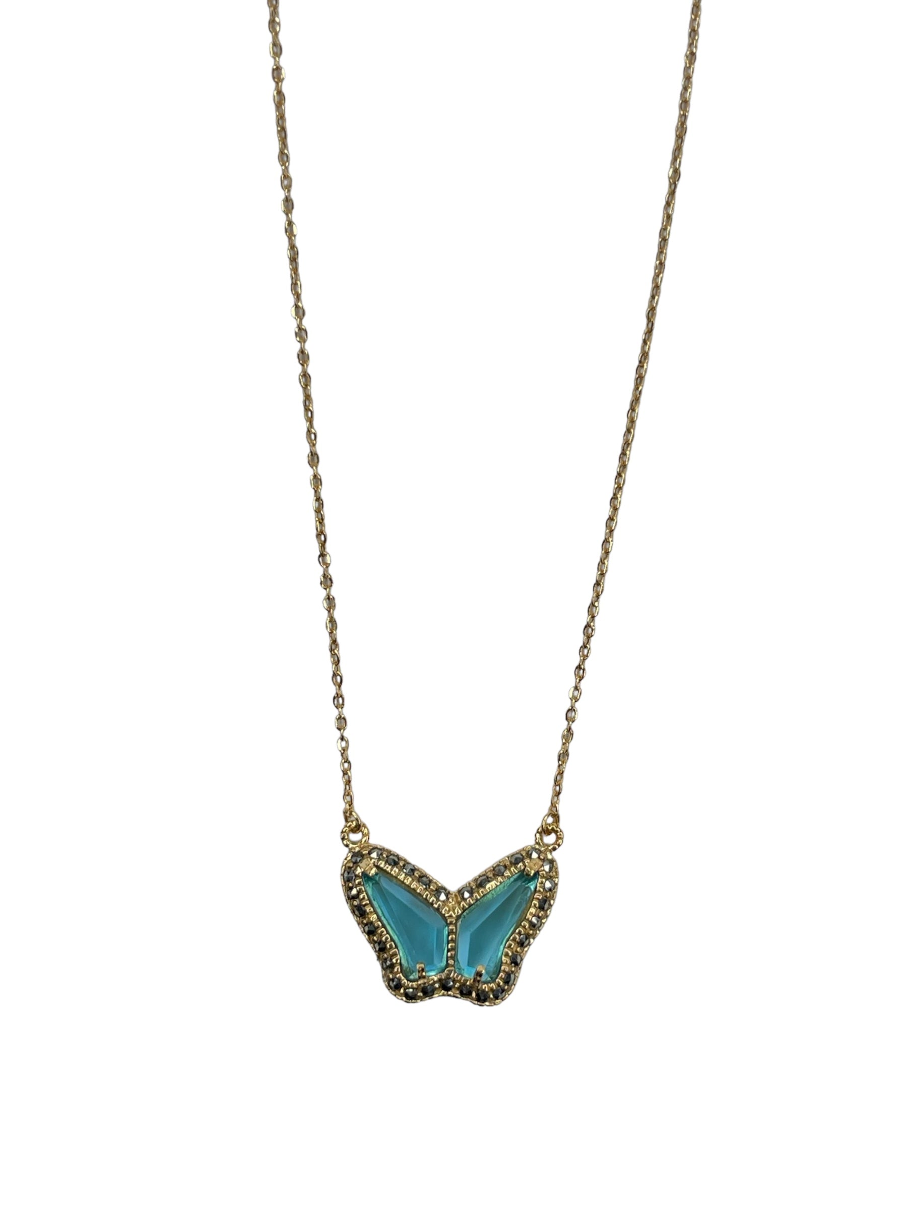 Collier papillon avec cristal taillé bleu antique, argent .925 avec placage en or 14 carats.