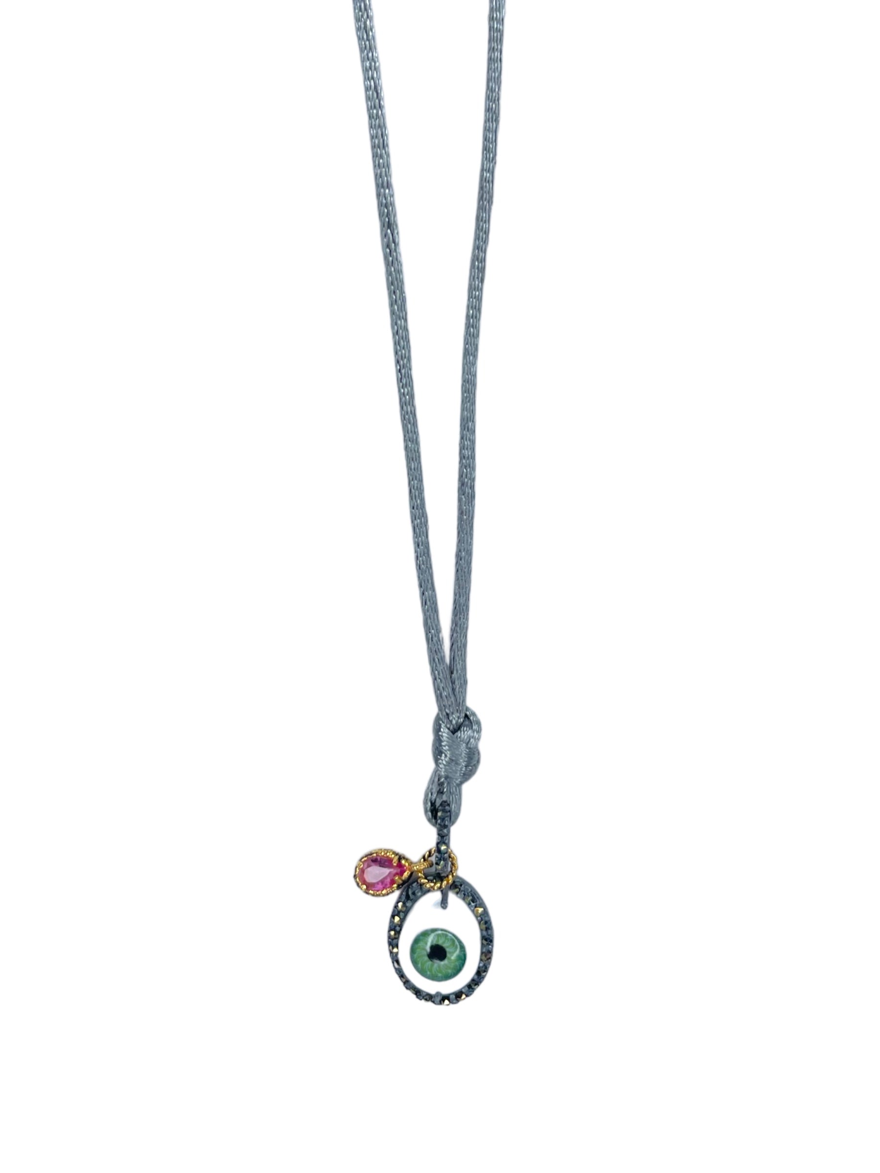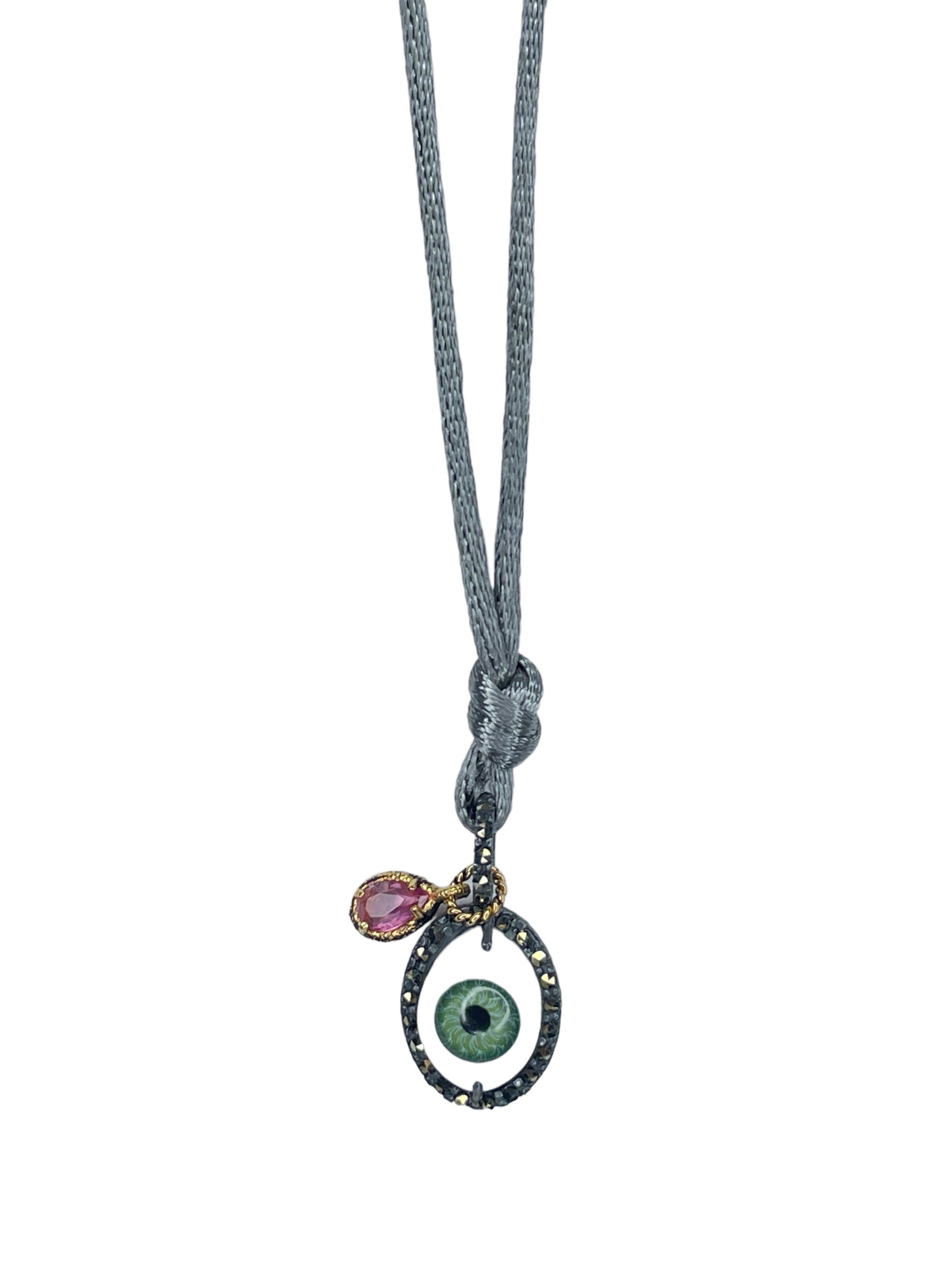 Collier en fil de soie avec pendentif œil bleui en argent .925 incrusté de pyrites et mini goutte avec placage en or coloré 14 carats.