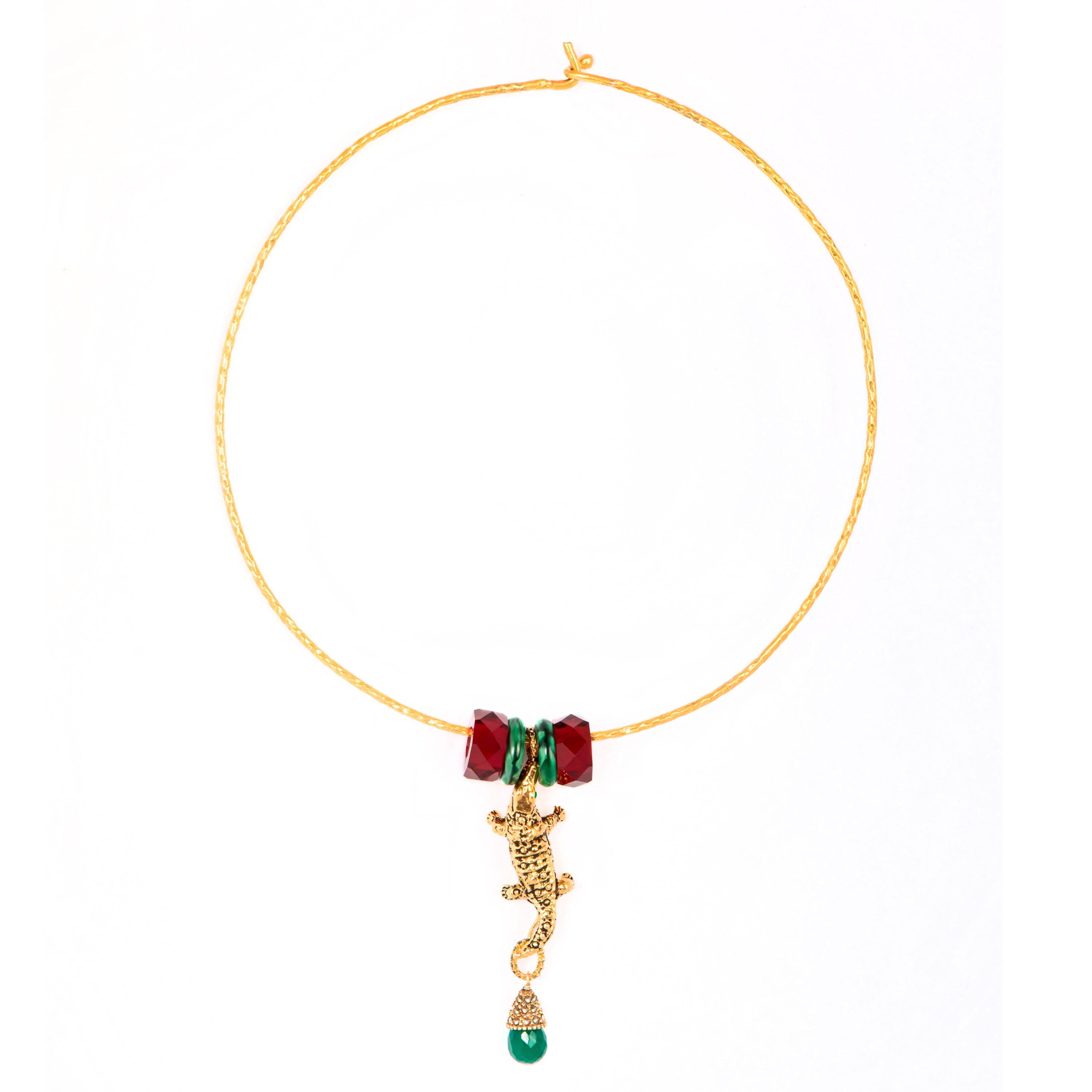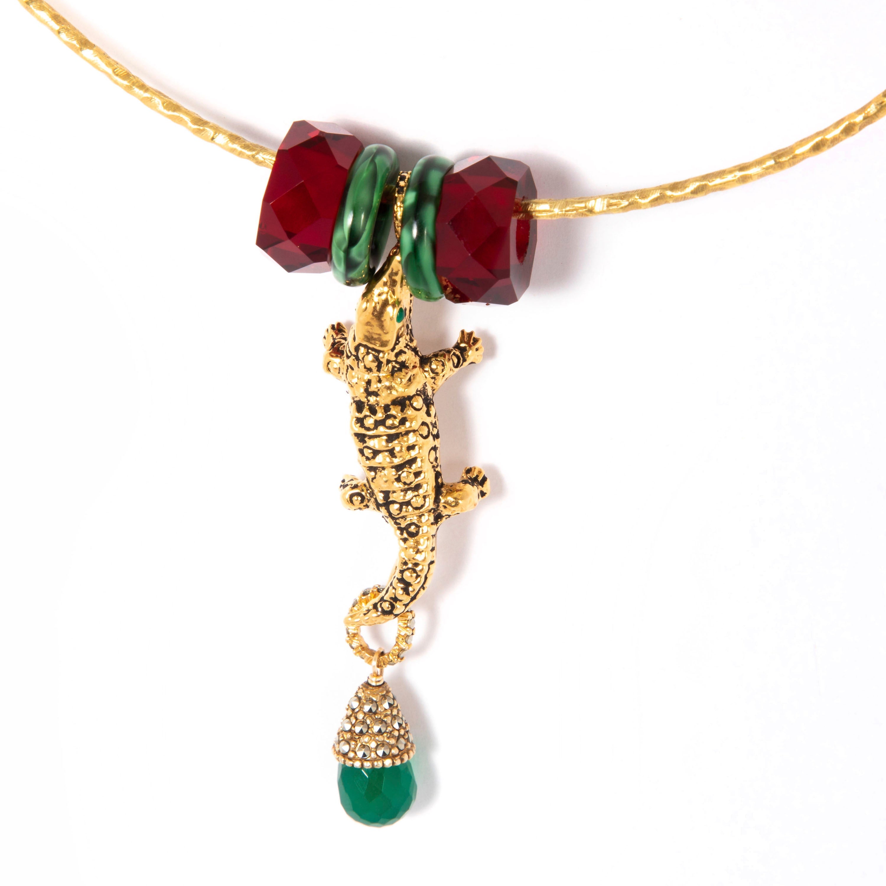 Collier rigide en alliage métallique avec breloques en cristal à facettes et pendentif crocodile en argent .925 avec placage en or 14 carats et incrustation de pyrites