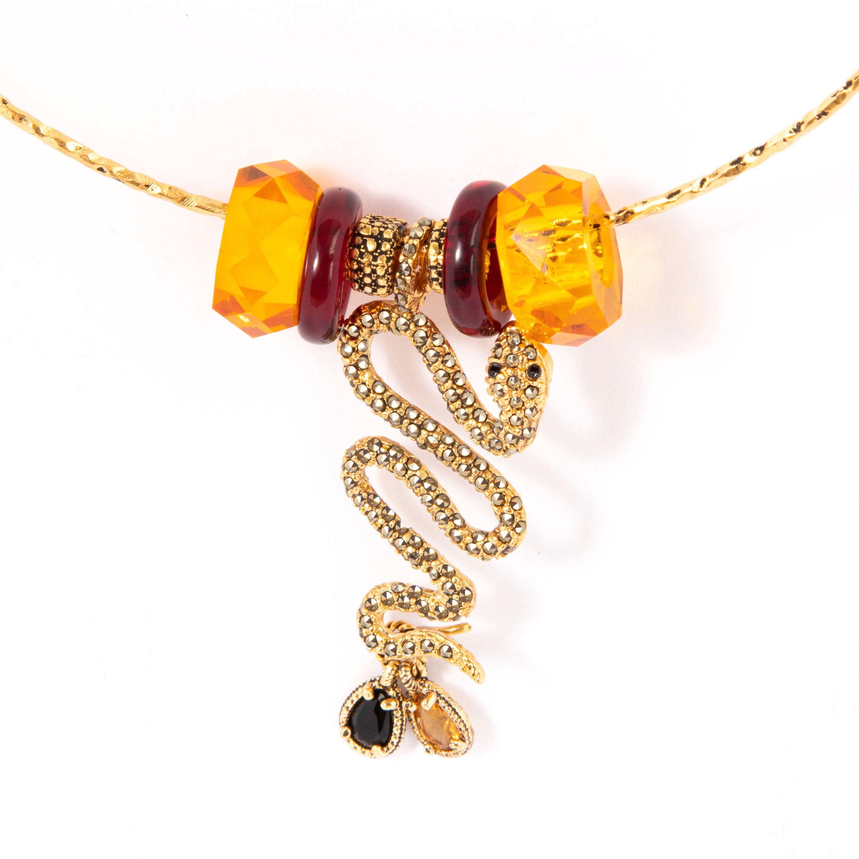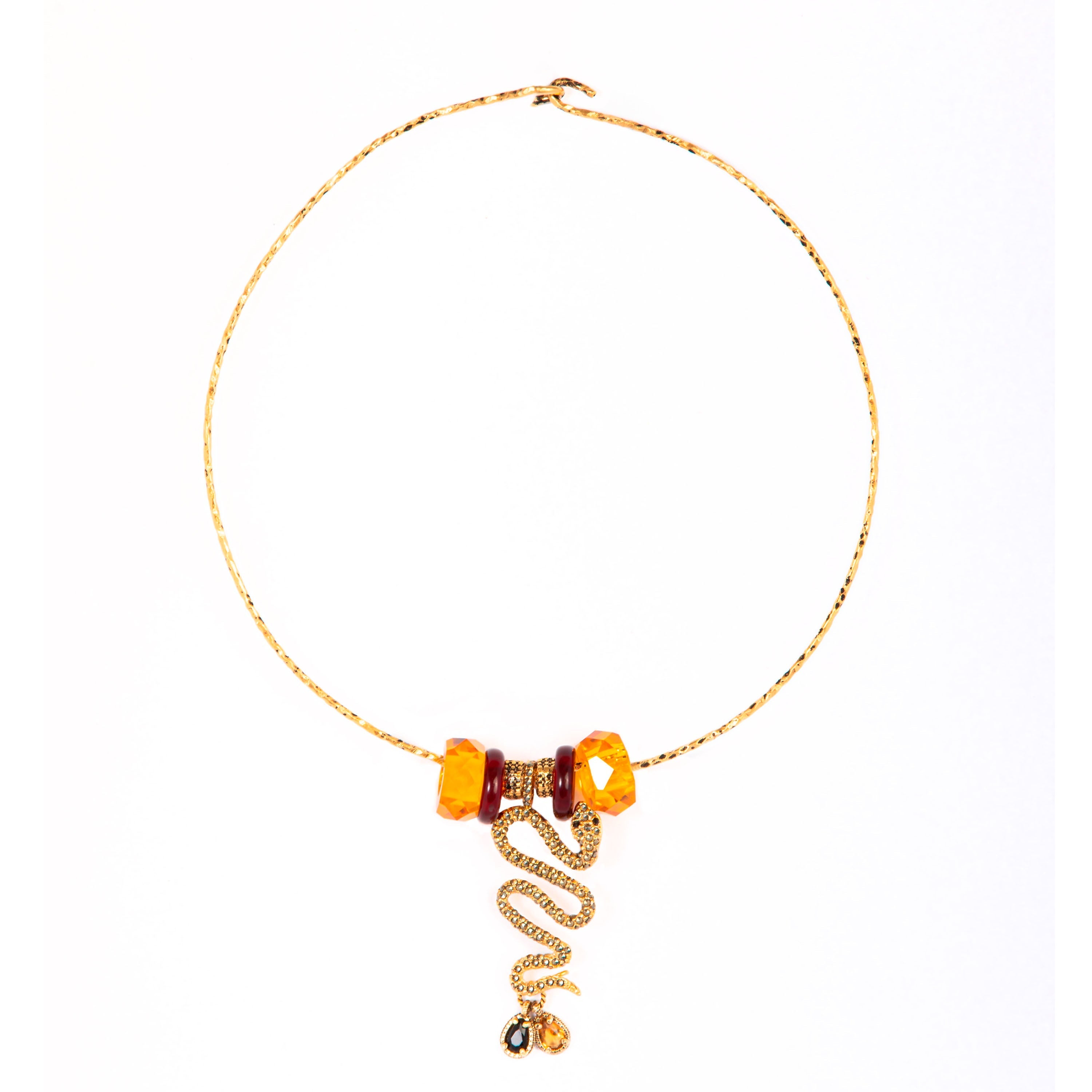 Collier rigide en alliage métallique avec breloques en cristal à facettes et pendentif vipère en argent .925 avec placage en or 14 carats et incrustation de pyrite.