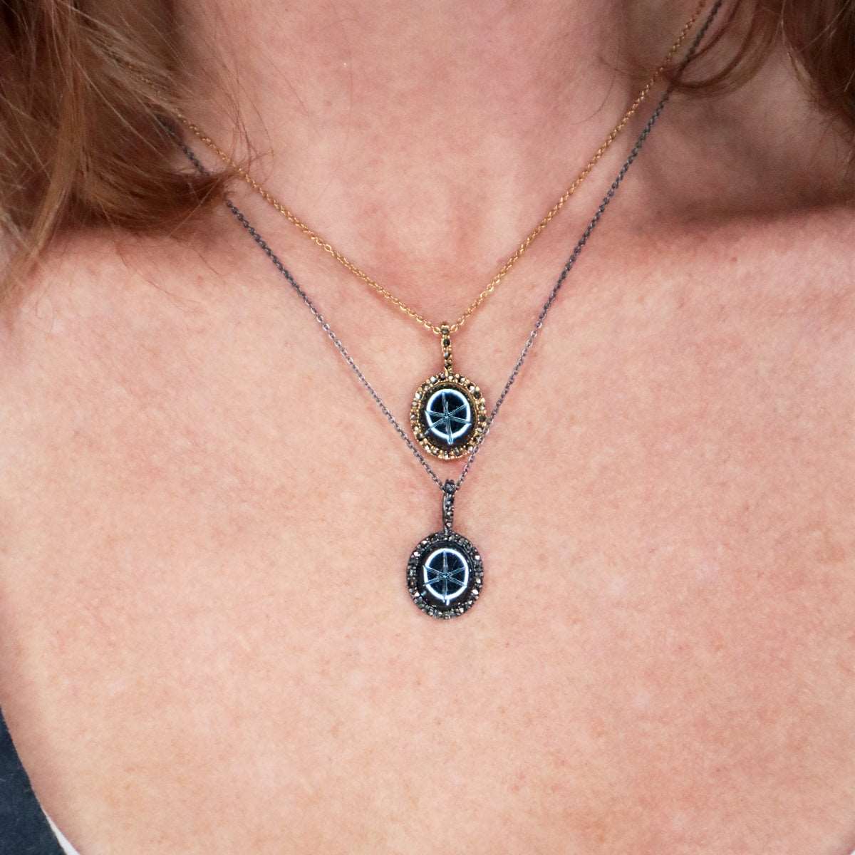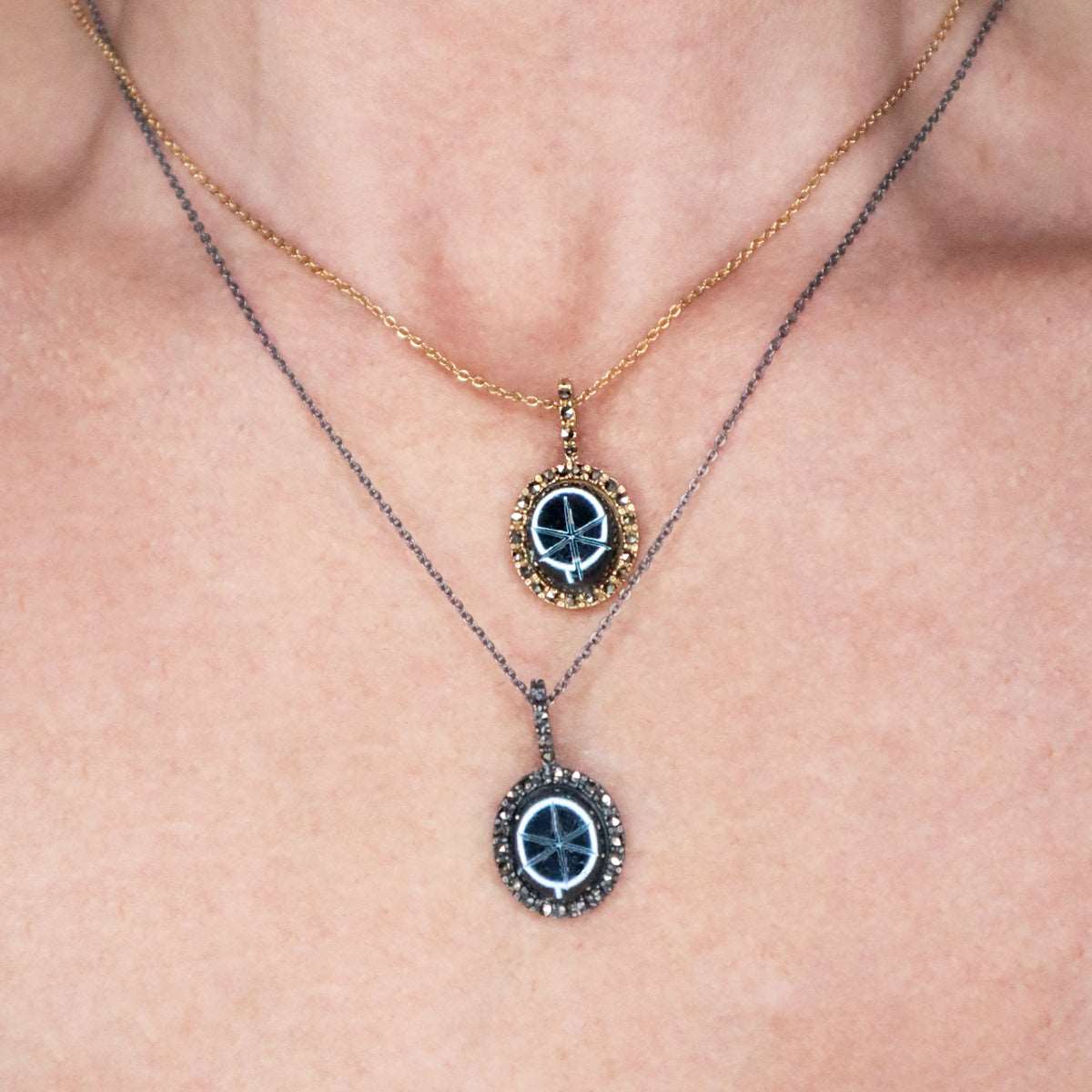 Chaîne en argent .925 avec placage en or 14 KT et pendentif boussole en argent .925 avec placage en or 14 KT et incrustation de pyrite