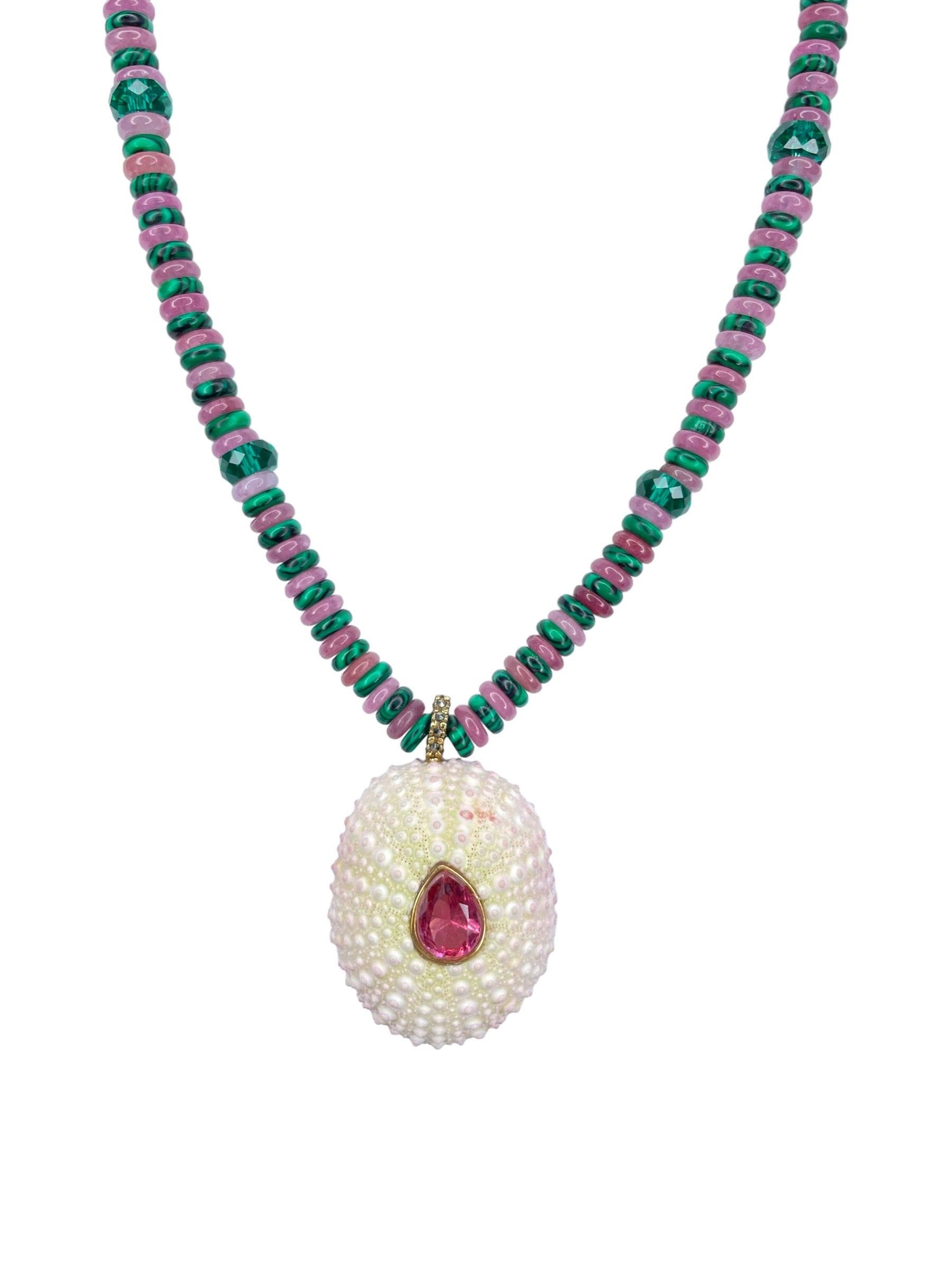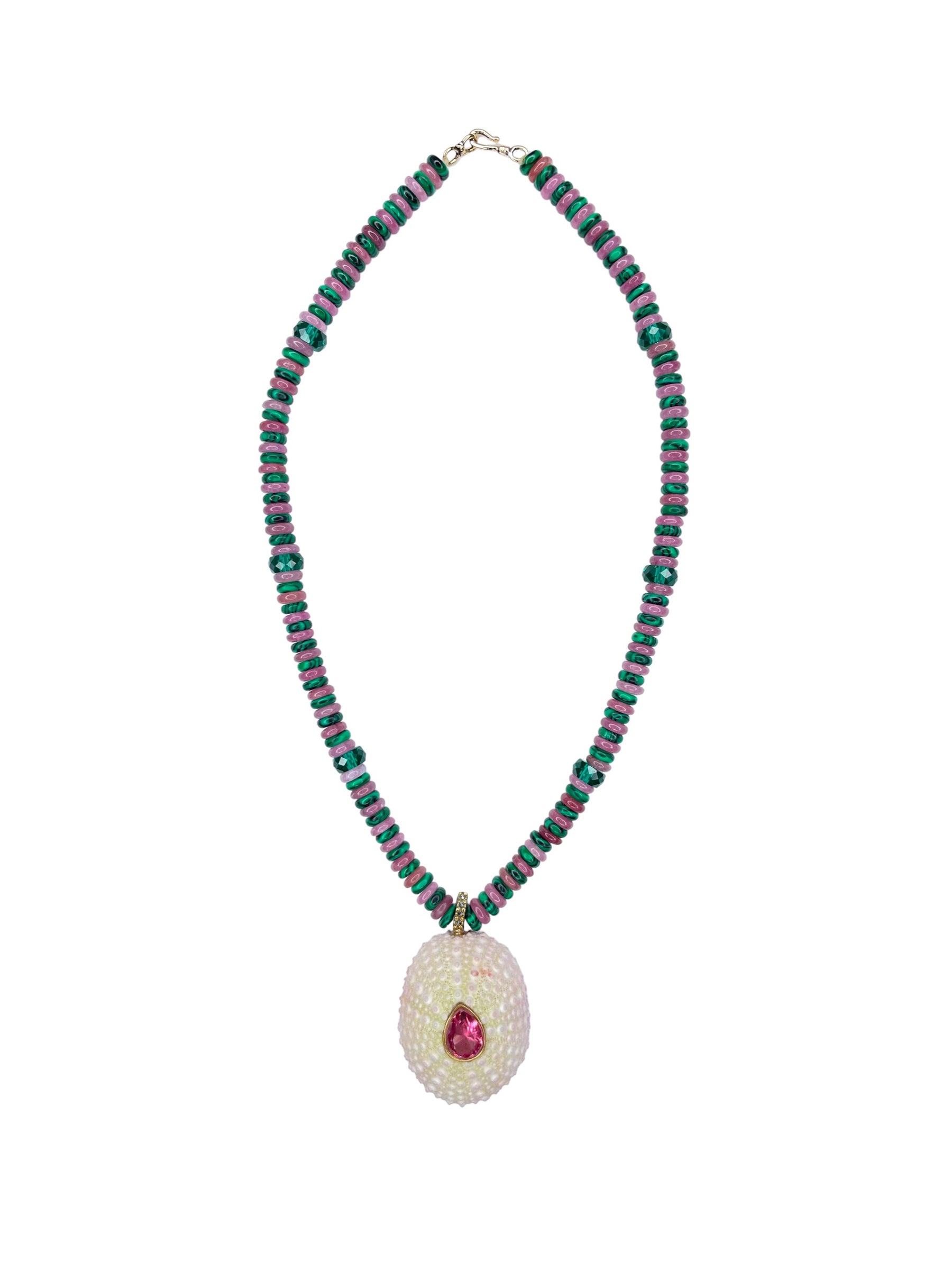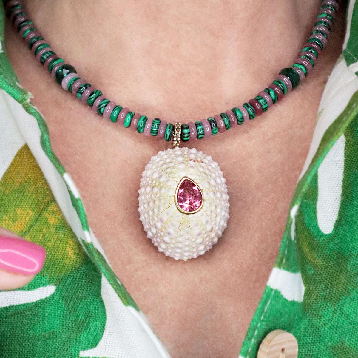 Collier cocarde en tourmaline avec pendentif en éponge naturelle incrusté d'une petite goutte de cristal rose facetté en argent .925 plaqué or 14 carats.