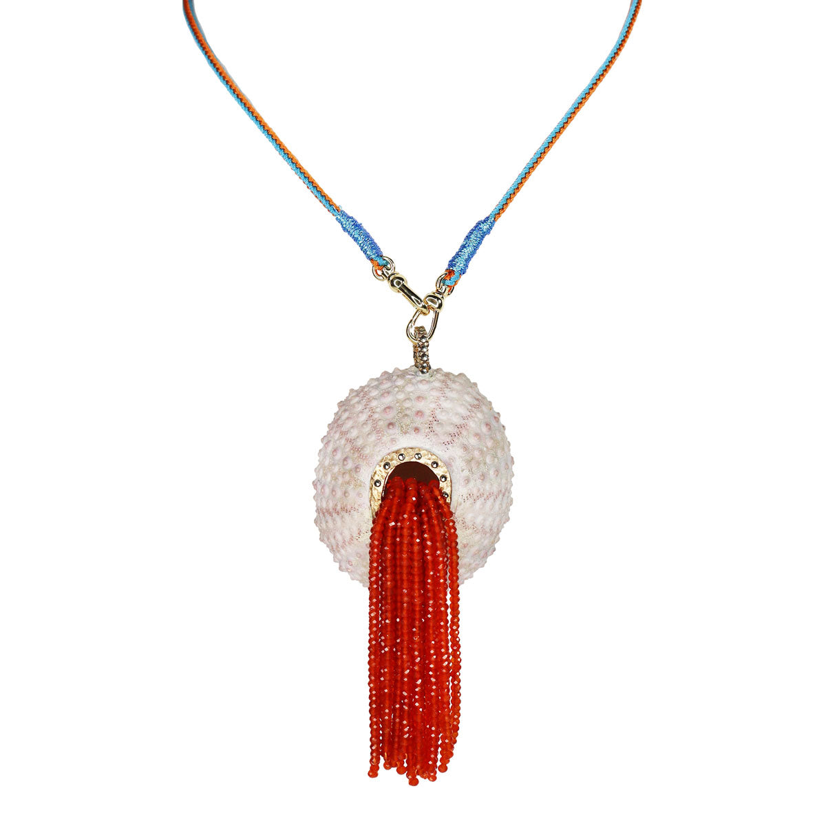 Collar hilo tejido mas dije concha de mar con piedras naranjas