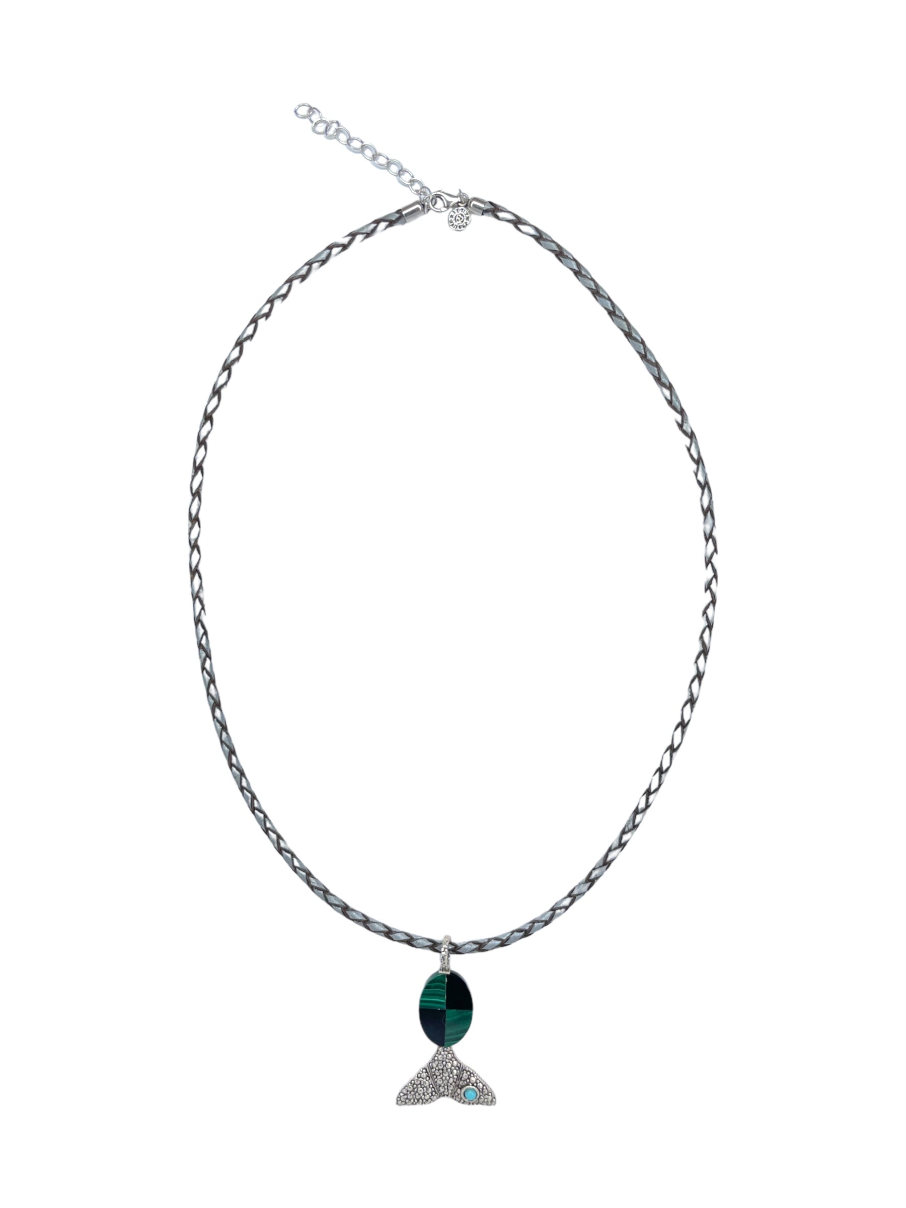 Collier en cuir tressé avec pendentif queue de baleine en argent .925 incrusté de pyrites et mosaïque d'onyx avec malachite.