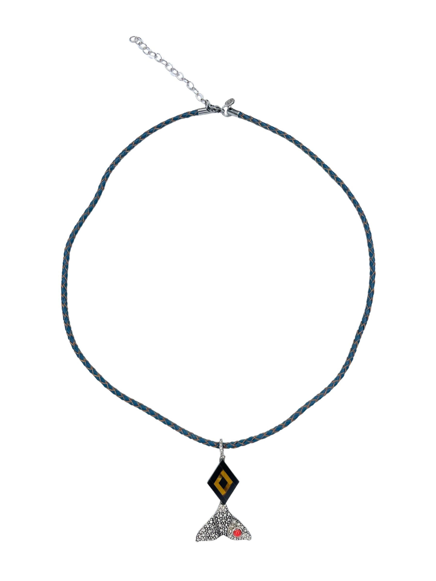Collier en cuir tressé avec pendentif queue de baleine en argent .925 incrusté de pyrites et mosaïque d'onyx avec malachite.