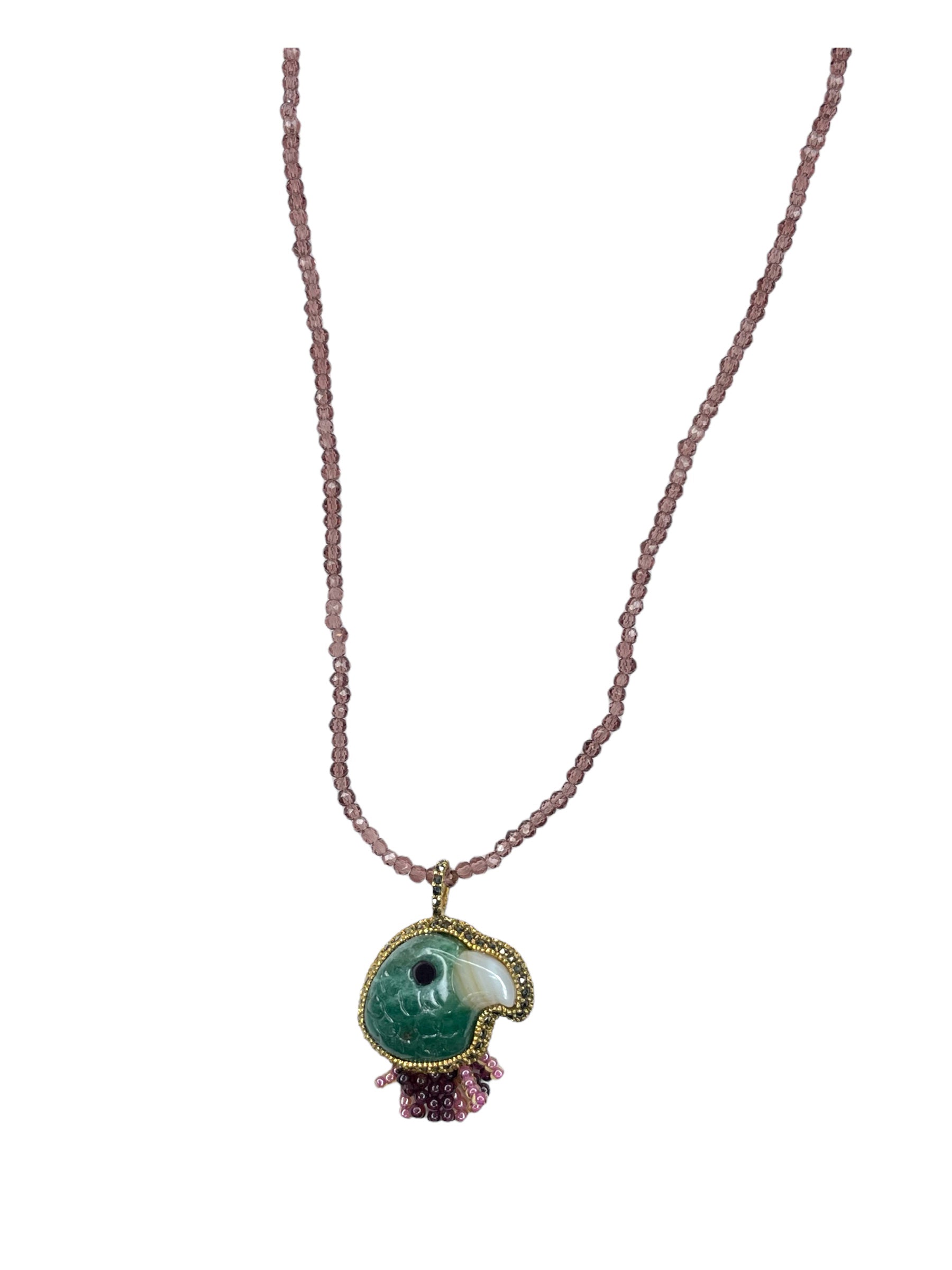 CABEZA DE PERICO DE VENTURINA NATURAL TALLADO A MANO CON COLLAR DE CUENTITAS DE CRISTAL FACETADO MONTADO EN PLATA .925 CON BAÑO DE ORO DE 14 KT.
