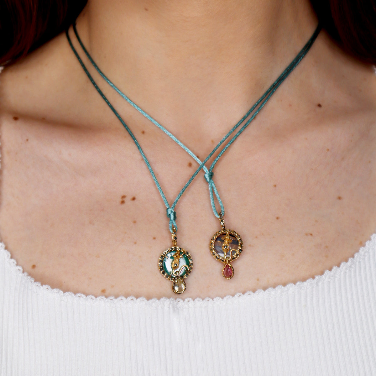 Collier en fil de soie bleu avec pendentif en argent .925 incrusté de pyrites, avec centre malachite et souris en argent .925 plaqué or 14K avec mini goutte or ou avec centre gris avec goutte rose