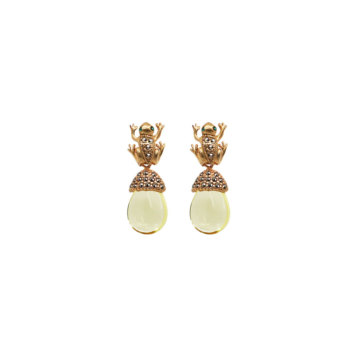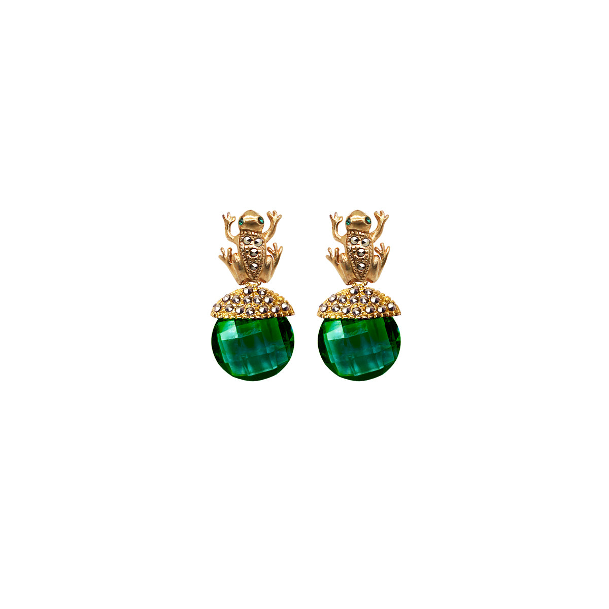 Arete rana gold plata .925 con baño de oro de 14KT e incrustación de piritas mas drop clásico ch cristal facetado rojo en plata .925 con baño de oro de 14KT, drop fut gde verde y drop hatty ch amarillo ambos con capuchon en plata .925 con baño de oro de 14KT e incrustación de priritas